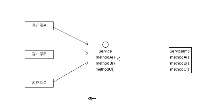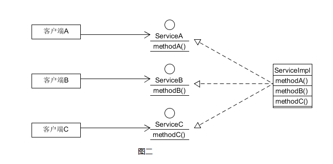 图二采用的是接口分离原则,对每个客户类都有一个专用的接口,这个接口中只声明了与这个客户类相关的方法,而ServiceImp类实现了所有的接口。如果客户端A要改变它所使用的接口中的方法,只需改动ServiceA接口和ServiceImpl类即可,客户端B和客户端C类不受影响。